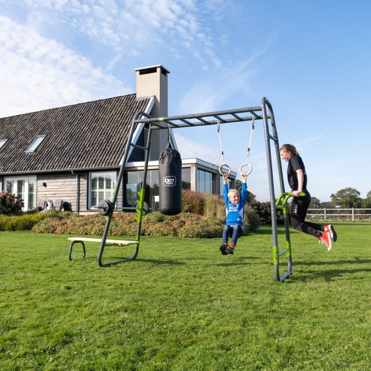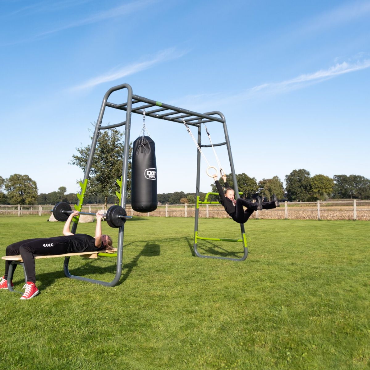 Sie möchten Ihren Garten in einen persönlichen Trainingsbereich für sich und Ihre sportlichen Teenager verwandeln? Das EXIT GetSet Monkey Bar MB230 ist ein über vier Meter langes, multifunktionales Outdoor-Fitness-Rack, das speziell für aktive 14-Jährige und Erwachsene entwickelt wurde. Dank des Komplettsets aus sieben hochwertigen Zubehörteilen – darunter Fitnessbank, Boxsack und Langhantelstützen – ermöglicht dieses Gerät ein komplettes Ganzkörpertraining an der frischen Luft. Trainieren Sie, wann immer Sie wollen, ohne Kompromisse.