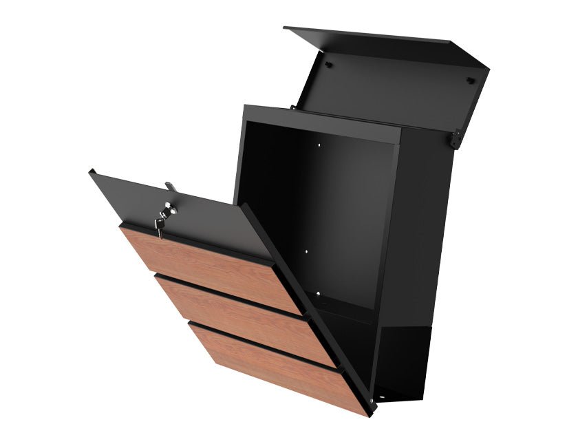 Der Briefkasten Cannes besticht durch seine Holzoptik , kombiniert mit einer mattschwarzen Pulverbeschichtung. Dies sorgt für ein natürliches und warmes Aussehen, ohne die Haltbarkeit und Festigkeit des Stahls zu beeinträchtigen. Das Design ist perfekt für alle, die einen modernen Look mit einem dezenten, rustikalen Touch lieben.