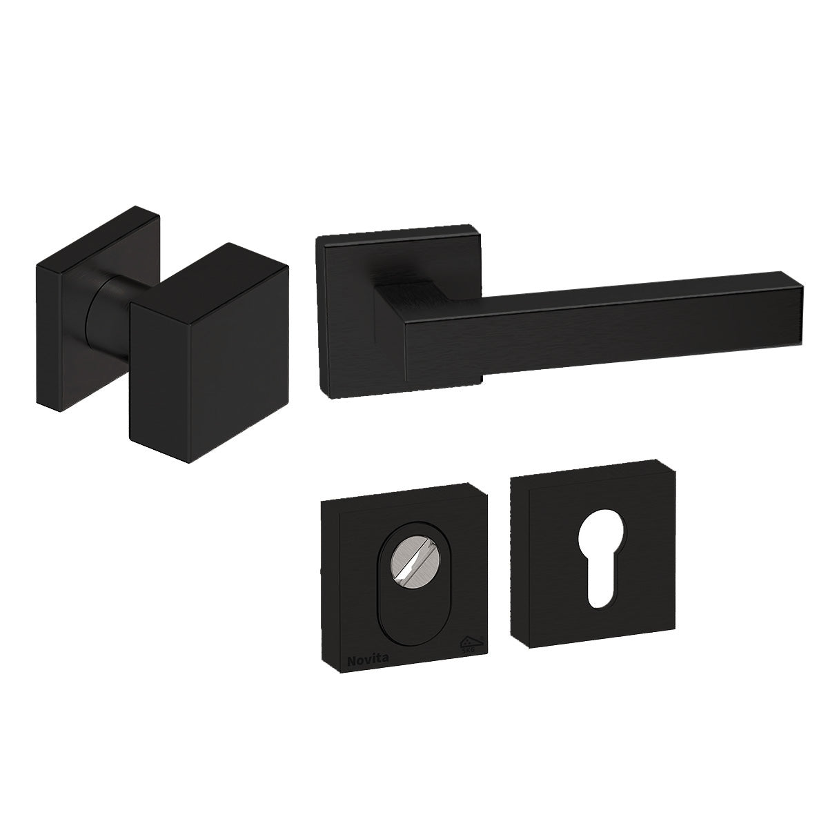 Das eckige Haustürset mit Quadro 50 schwarz ist eine stilvolle und sichere Wahl für Ihre Haustür. Die Garnitur besteht aus einem verdeckt liegenden Haustürknauf, einer SKG*** geprüften Sicherheitsrosette mit Kernziehschutz und einem rechtwinkligen Türdrücker für die Innenseite. Der Türgriff ist mit einem Federmechanismus ausgestattet und universell links sowie rechts verwendbar.