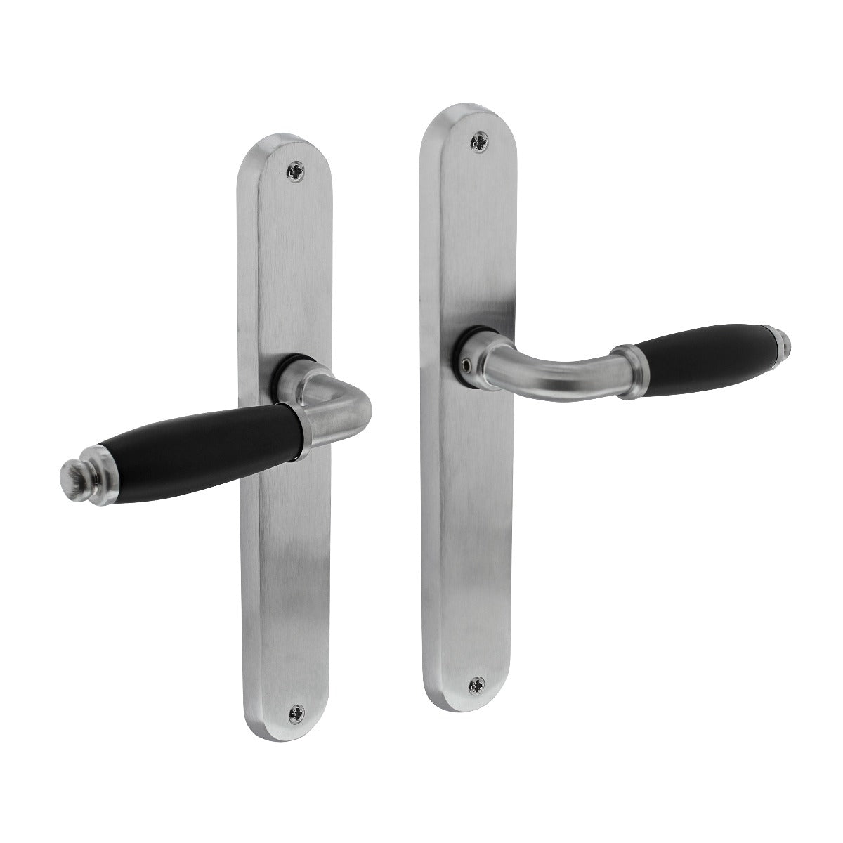 Deurkruk Courgette kenmerkt zich door een stijlvolle en bijzondere vormgeving. Deze deurklink op een ovaal blind schild is uitgevoerd in chroom en naderhand geborsteld, waardoor het een matte uitstraling krijgt. Door de combinatie met een zwarte greep, heeft deze kruk een bijzondere uitstraling. Deze kruk wordt per paar geleverd en het schild is voorzien van schroefgaten. Het voordeel van deurkrukken op schild is dat ze vaak de gaten afdekken die voorheen in de deur zaten. Set deurkrukken|Set schilden|Bevestigingsmateriaal voor montage