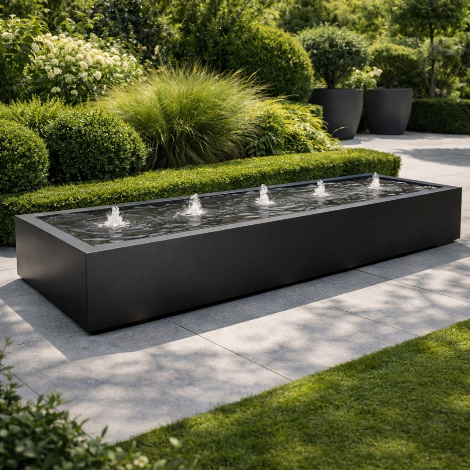 Een grote tuin vraagt om een krachtig en doordacht element dat rust brengt en tegelijk uitstraling geeft. De langwerpige aluminium watertafel met fonteinen van 400x100x40cm is ontwikkeld voor buitenruimtes waar schaal, balans en kwaliteit samenkomen. Het brede wateroppervlak, gecombineerd met meerdere fonteinen en geïntegreerde LED-verlichting, creëert een gecontroleerde waterbeleving die permanent bijdraagt aan sfeer en exclusiviteit, overdag én in de avond.