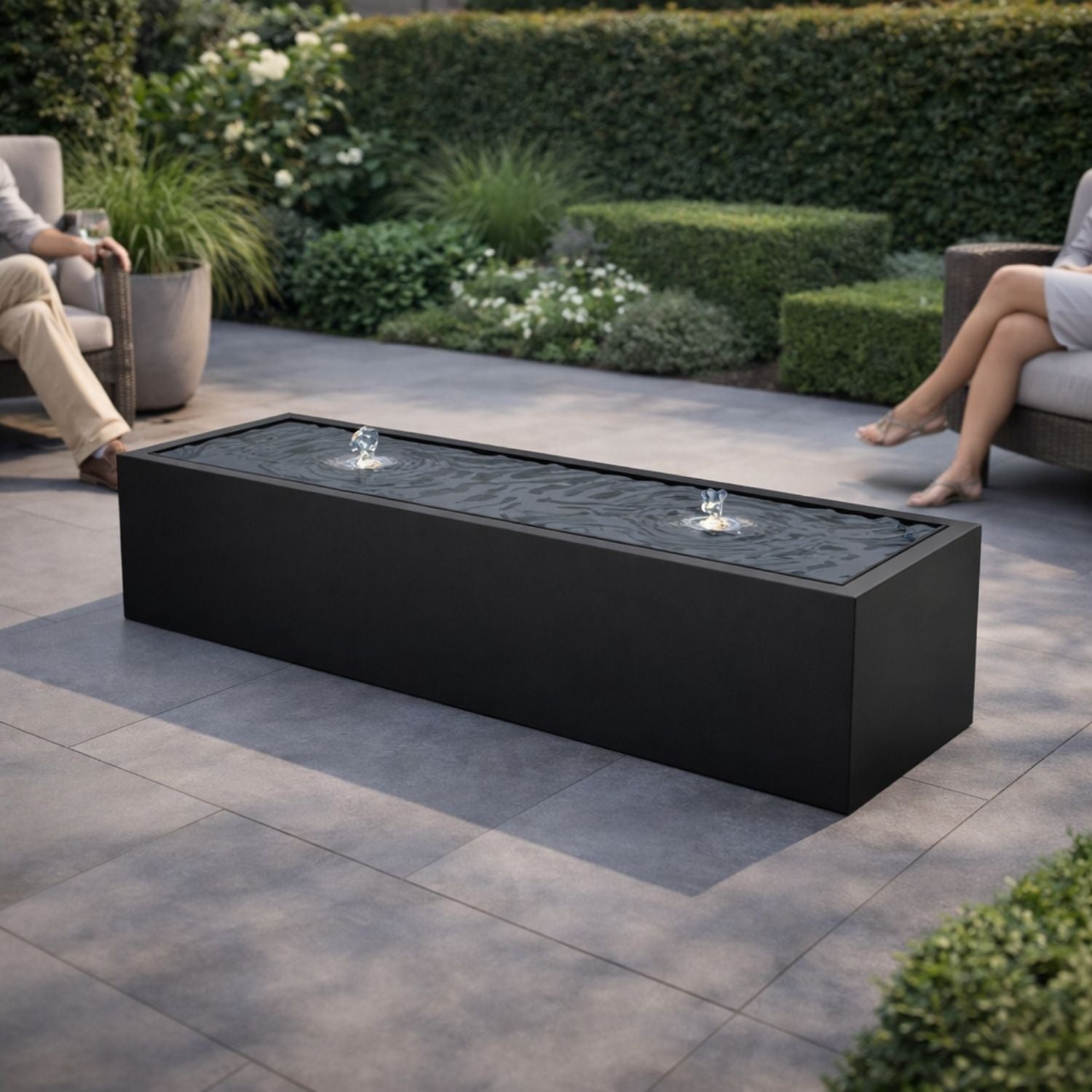 Nos nappes phréatiques sont une décoration unique pour les jardins. Les formes élégantes et angulaires ajoutent une atmosphère et une dynamique supplémentaires à tout espace extérieur. La nappe phréatique en aluminium Geroba Taula rectangulaire 200x60x40cm 39kg s'intègre parfaitement dans la verdure et grâce à la pompe standard et aux fontaines avec éclairage LED, vous pouvez profiter de manière optimale de l'effet apaisant de l'eau courante même dans l'obscurité.