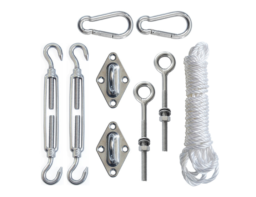 Que vous ayez une voile d'ombrage triangulaire ou carrée, ce kit de montage s'adapte à presque toutes les tailles et tous les types. Idéal pour un montage entre deux murs, d'un mur à un poteau ou d'un poteau à un poteau. Grâce aux pièces de tension fournies, vous pouvez tendre parfaitement la toile pour une stabilité optimale.