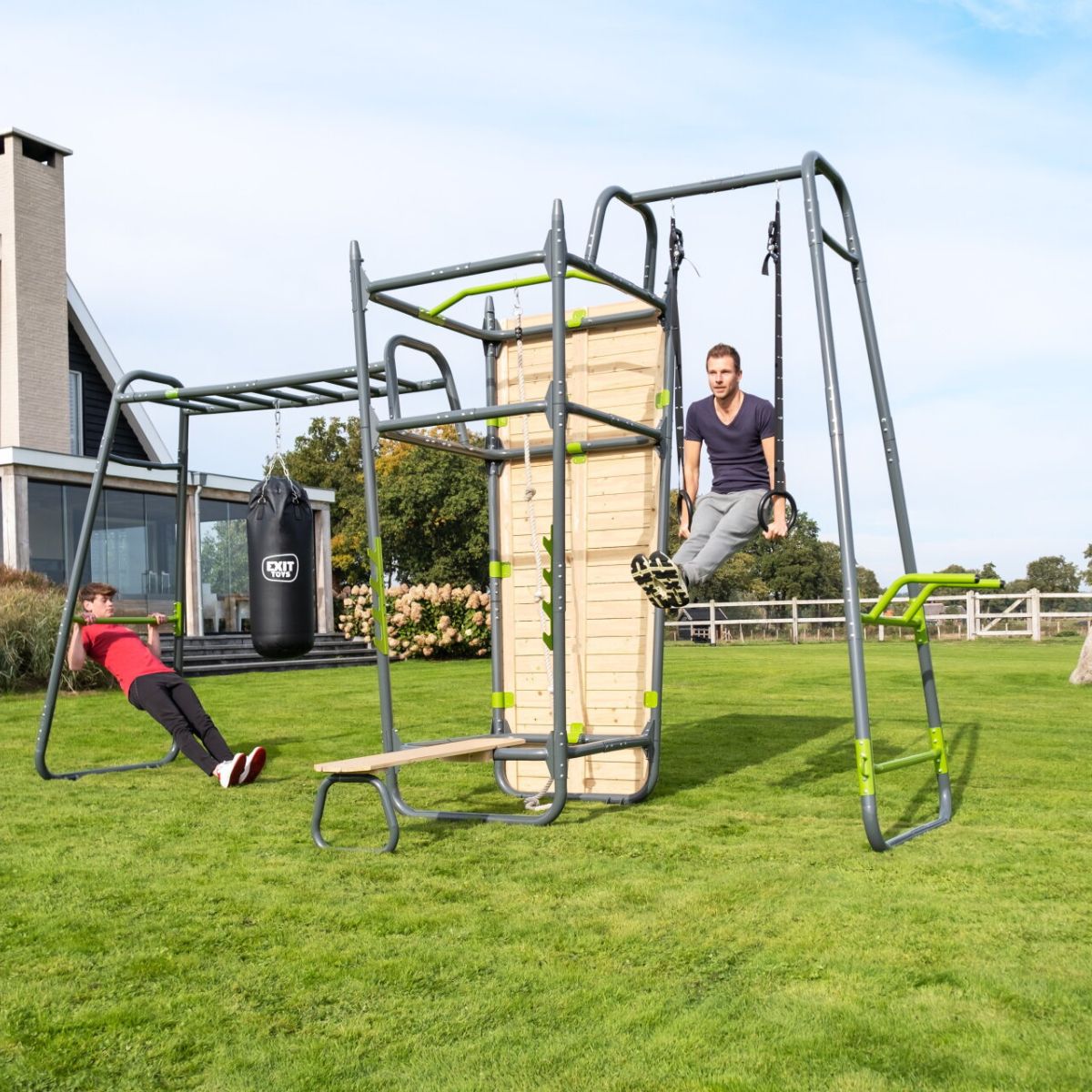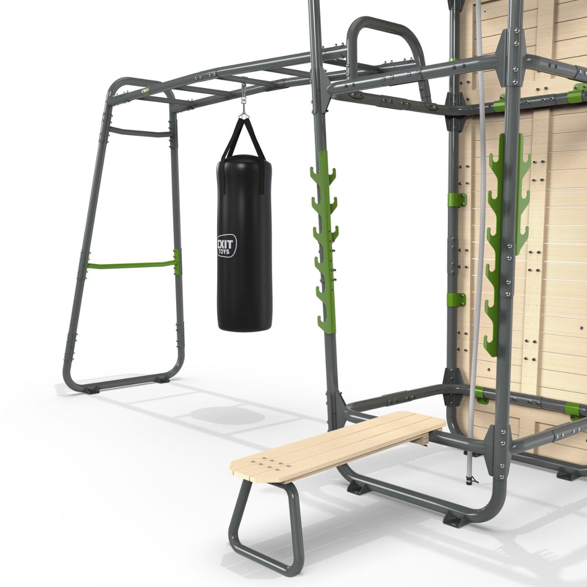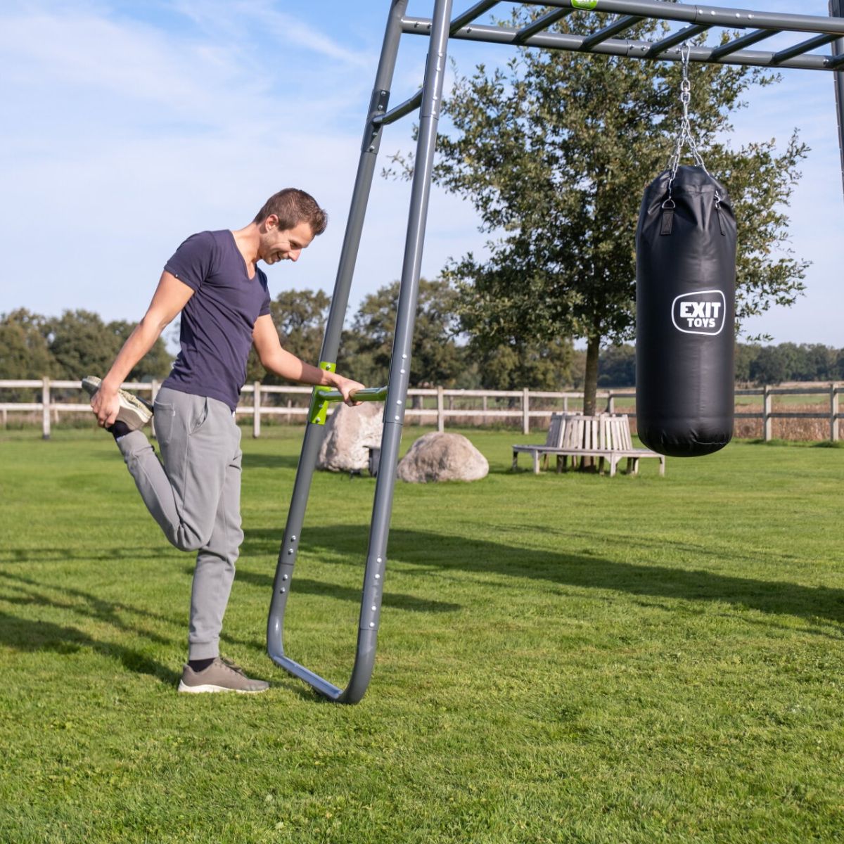 Vous recherchez une solution tout-en-un pour la musculation, le cardio et la coordination, directement dans votre propre jardin ? L'EXIT GetSet PS620 est un rack de fitness extérieur haut de gamme de plus de six mètres, conçu pour les sportifs de 14 ans et les adultes qui souhaitent tirer le meilleur parti de leur entraînement. Avec douze accessoires inclus, dont un sac de frappe, un banc de fitness, une barre de singe et un mur d'escalade, vous pouvez créer une salle de sport extérieure complète pour chaque jour, chaque instant et chaque niveau.