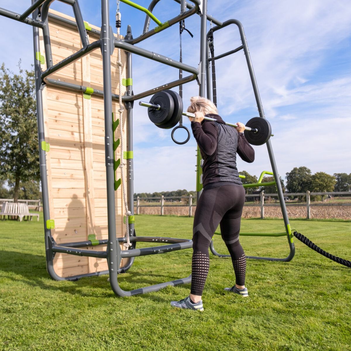 Le cadre est en acier galvanisé et revêtu de poudre, résistant à la rouille et aux intempéries. Les connecteurs en plastique empêchent les bruits de craquement ou de grincement, garantissant une séance d'entraînement confortable. Avec son design moderne et sombre et les tons verts luxueusement finis des accessoires, cet appareil s'intègre également parfaitement dans n'importe quel jardin - élégant, stylé et sportif.