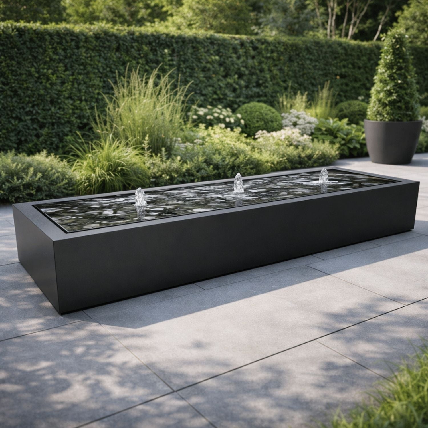 Nos nappes phréatiques sont une décoration unique pour les jardins. Les formes élégantes et angulaires ajoutent une atmosphère et une dynamique supplémentaires à tout espace extérieur. La nappe phréatique Geroba Taula Aluminium rectangle 300x80x40cm 70kg s'intègre parfaitement dans la verdure et grâce à la pompe standard et aux fontaines avec éclairage LED, vous pouvez également profiter de manière optimale de l'effet apaisant de l'eau courante dans l'obscurité.